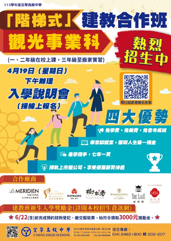 轉知:宜寧高中4/19辦理「階梯式建教合作班學制暨合作廠商說明會」活動,請國三學生暨家長參閱
