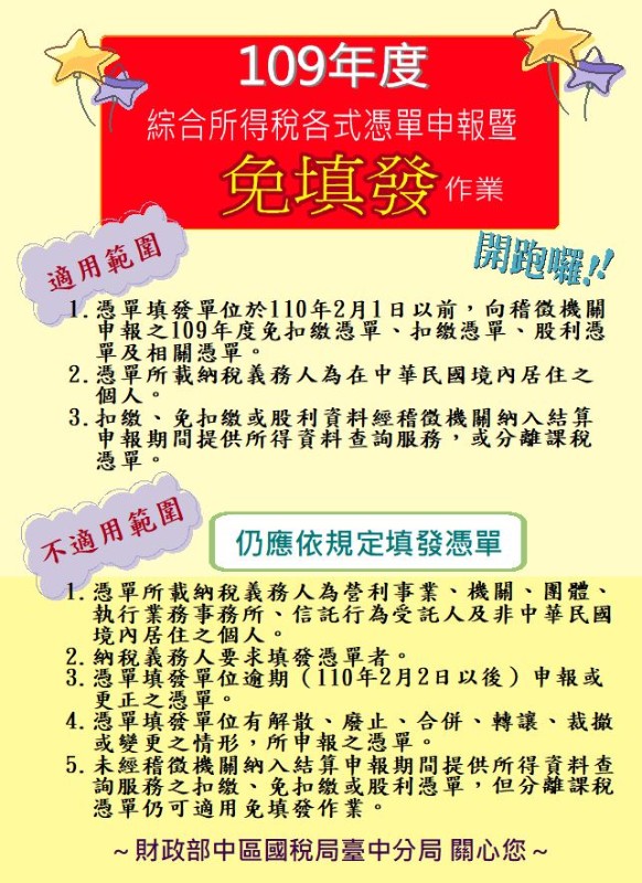 | 標題 | 配合財政部中區國稅局加強宣導109年度所得稅各式憑單申報暨免填發作業 |
