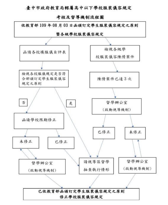 本校將定期檢視、修正學生獎懲與輔導、服裝儀容等相關規定,務求符合 台中市政府教育局最新原則與法規,並保障學生權益,提升透明度與程序正義。