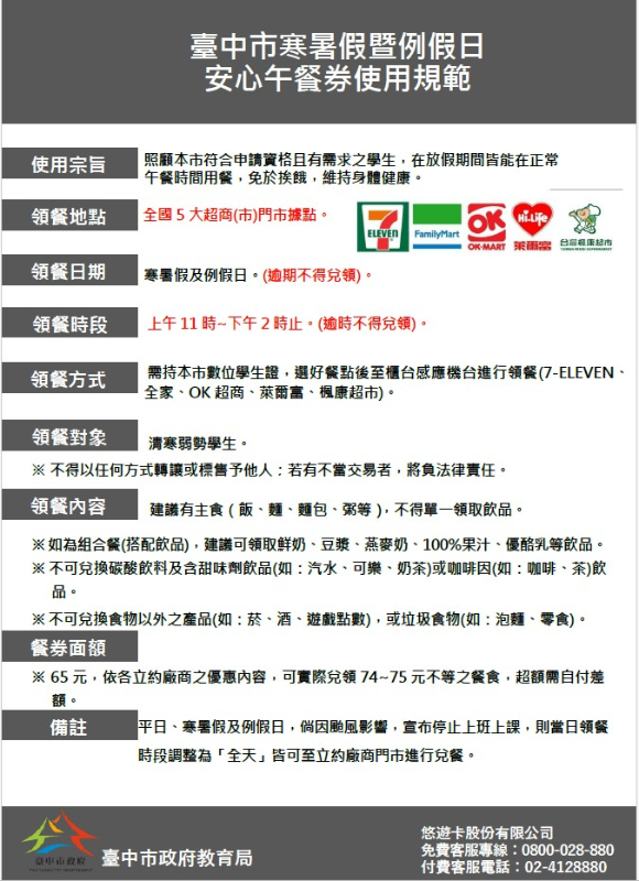 宣導本市安心午餐券兌餐方式及相關配套措施 一.學生務必妥善保管數位學生證,並請儘量以數位學生證進行兌餐。 二.學生務必先將自己的學生證正反兩面拍照留存或記錄「學號+外觀卡號」,以因應未攜帶數位學生證或遺失. 五大超商可協助兌餐方式如下: 1.萊爾富:萊爾富LifeET的多媒體事務機(Kiosk)提供以手動輸入「學號+外觀卡號」方式,即可印出小白單兌領。 2.7-ELEVEN、OK、全家及楓康超市:請報出「學號+外觀卡號」,請門市人員以POS機手動輸入「學號+卡號」兌領。 3.有關現行臨櫃登記兌餐配套措施仍維持,但僅限於臺中市門市實施。 相關宣導如附件所示