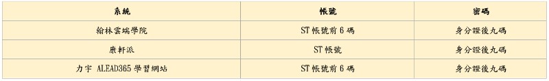 大甲國中力宇 ALEAD365學習網站 tjjhtc.ailead365.com 康軒派 https://tjjh-tc.kschool.com.tw/login 康軒影音 https://digitalmaster.knsh.com.tw/all/video/j/math.html 翰林雲端系統 tjjh.teamslite.com.tw