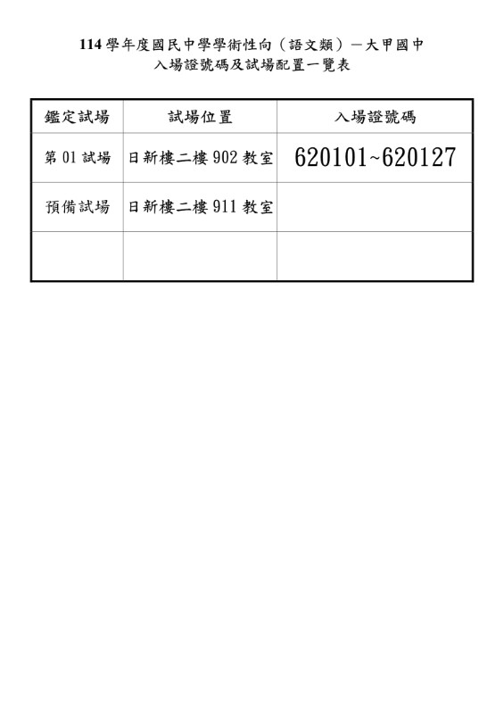 | 標題 | 【公告】114資優學生鑑定《大甲國中》試區試場位置圖與入場證號碼分配表 |