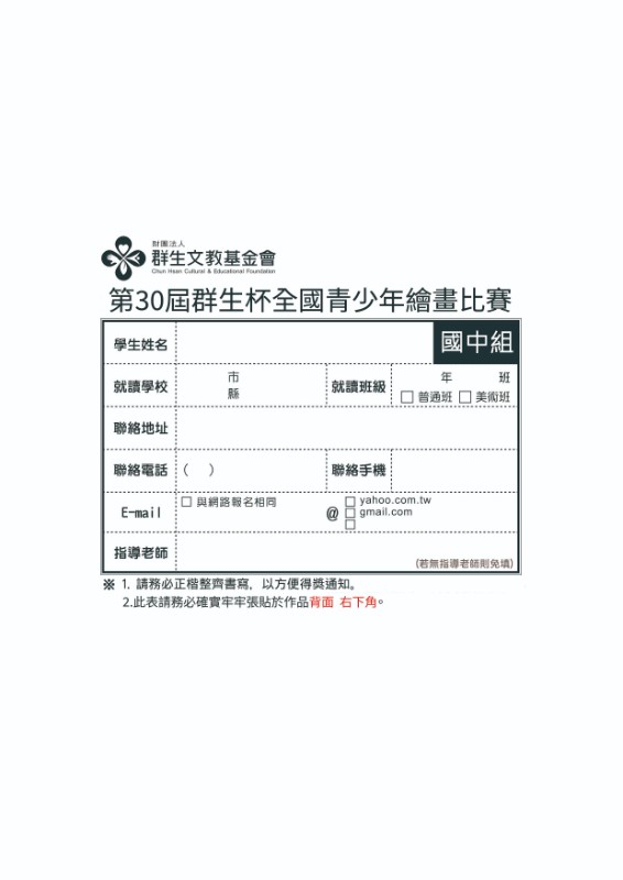 說明:一、比賽方式及時間:(詳細資訊請見簡章說明)【第一階段】實體收件 115年 2月 12日 (星期四) 前,郵戳為準【第二階段】現場複賽 115年 3月 14日 (星期六) 8時 至12時地點:復興商工二、參加對象:全國各公私立國中 7、8、9 年級在學學生。三、獲入選以上之學生申請就讀復興商工,享優先錄取資格。四、線上報名網址:https://reurl.cc/rYy4Ok五、比賽簡章公告於群生基金會網站首頁 https://ischool.fhvs.ntpc.edu.tw/ischool/publish_page/193/,敬請下載查閱。