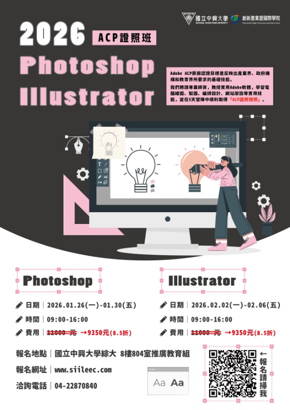針對想學習電腦繪圖、製圖、編排設計、網站架設等實用技巧,規劃《Adobe軟體ACP證照輔導》5日營,分別策畫Photoshop、Illustrator軟體,協助學生順利取得產業界、政府機構和教育界所認可ACP國際證照,滿足各界所要求的基礎技能。
