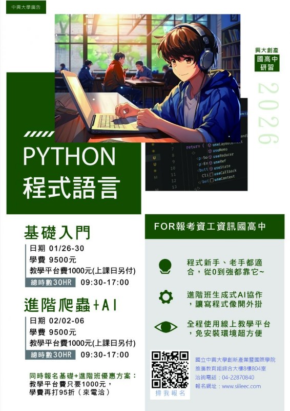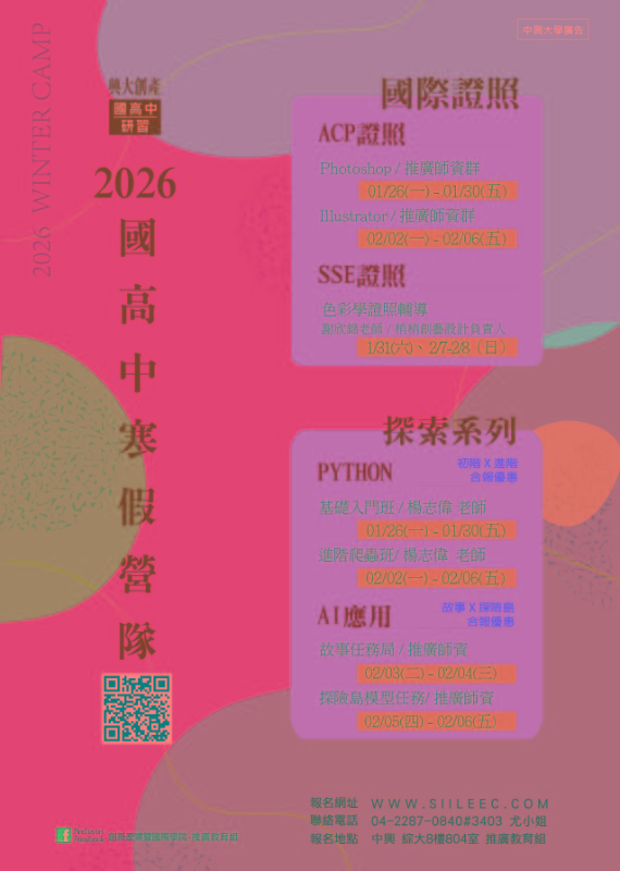 轉知~中興大學舉辦2026年寒假Python程式設計系列、ACP與SSE色彩學國際證照輔導、AI應用故事 X 探索島系列招生海報與簡章,即日起開放報名。