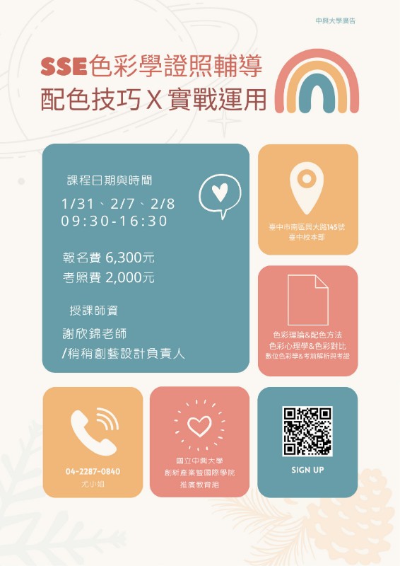 針對想增進色彩學配色養成,提供《色彩學國際SSE證照輔導》,為您申請國內外單位備審加分。