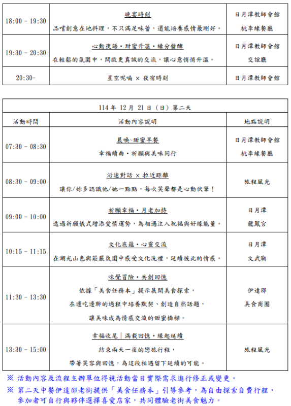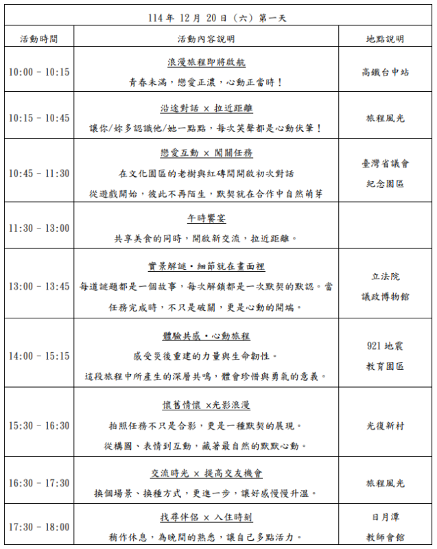 報名資格:1.台灣區各公私立中小學校現職教職員工。2.須年滿 20 歲以上,並應保證其婚姻狀態為單身。(建議 45 歲以下)3.預計活動人數為 40 人,本次活動報名人數 25 人,另邀請跨領域人士 15 人。(原則男女各 20 人)4.男女報名人均以未參加過本會單身聯誼活動者為優先。
