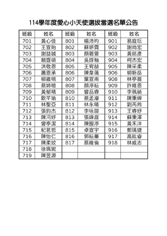 【公告】本校114學年度愛心小天使選拔當選名單公告