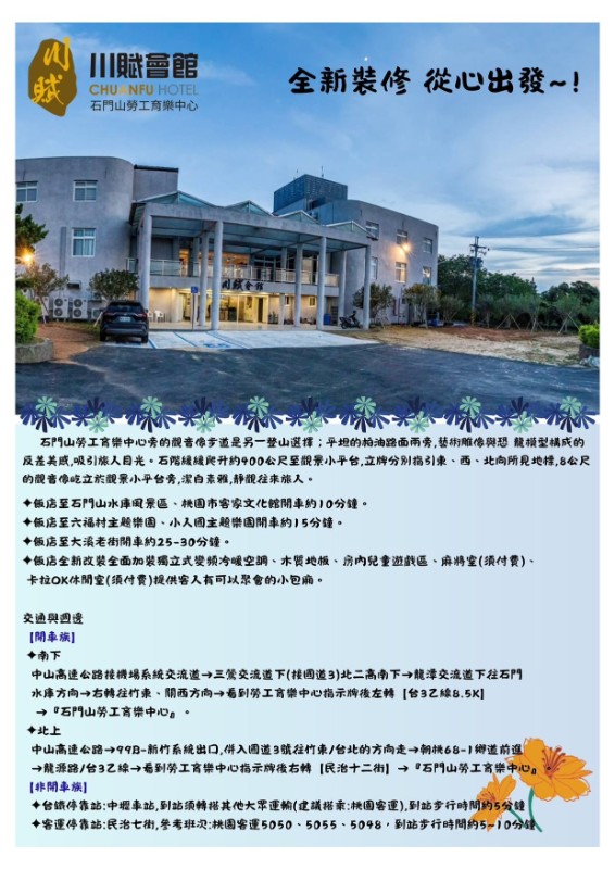 【轉知】桃園市「石門山勞工育樂中心-川賦會館」已開幕營運中並為國民旅遊卡特約商店