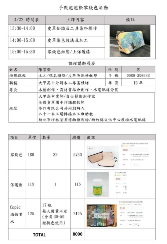 臺中大甲教育會和大甲高中合辦「泡泡染零錢包」實做體驗課程乙份,機會難得,歡迎教育會所有成員踴躍報名參加。 |