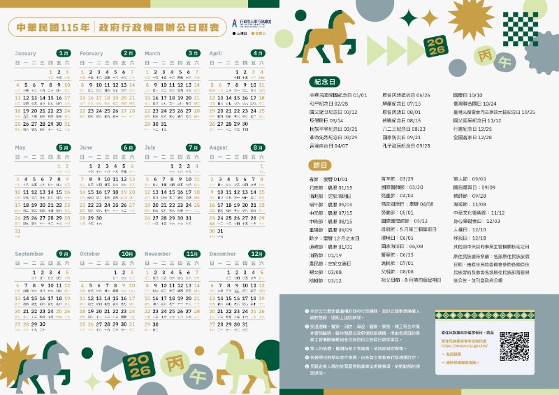| 標題 | 「中華民國115年政府行政機關辦公日曆表」業公告人事行政總處網頁,歡迎自行下載運用。 |