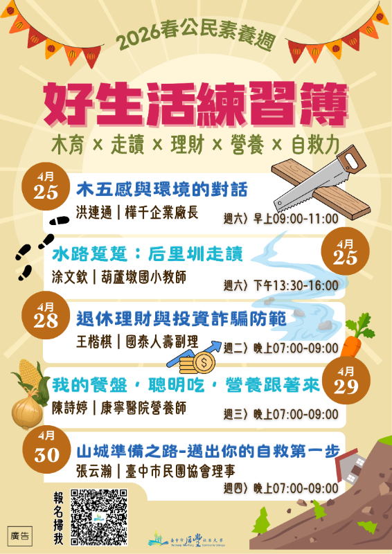 場次皆免費參與(部分場次酌收材料費),詳細內容請參閱后豐社區大學公民素養週報名頁面(https://forms.gle/A39mL5omQUEWjNM1A)或電洽承辦人。