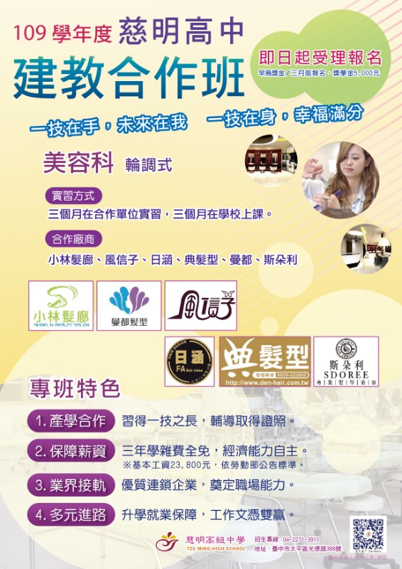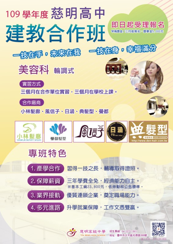 說明:一、本校為扶助經濟弱勢學生辦理餐飲管理科與美容科輪調式建教合作班。二、建教合作班可以讓學生一邊工作一邊讀書,讓經濟弱勢的學生可以自食其力完成學業,減輕家裡的負擔。三、為使學生更進一步了解建教合作教育之內容、實施方式、待遇福利及畢業出路,本校老師將樂意前往貴校辦理宣導說明。(一)對象:經濟弱勢或學習成就較低落的學生。(二)時間:自109年3月5日至4月7日止,以學校方便時間為佳(亦可利用早修或午休時間)。(三)地點:貴校安排場所。(四)敬請來電或來函告知擬安排之日期及時間。(聯絡人:教務處實研組或實習處建教組電話:04-2271-3911轉108、626)