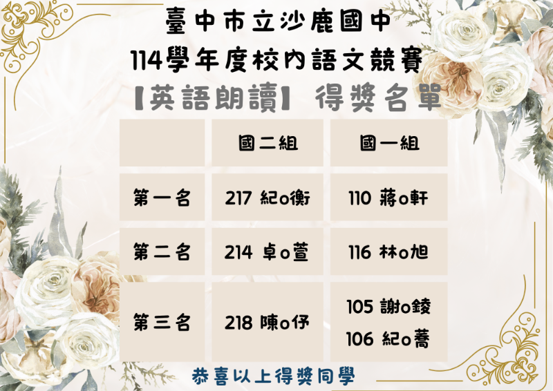 【公告】114學年度校內語文競賽「英語朗讀」得獎名單