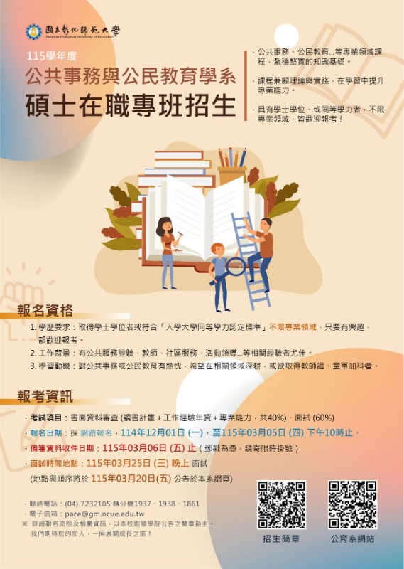 主旨: 檢送本校公共事務與公民教育學系115學年度碩士在職專班招生海報圖檔與簡章電子檔,敬請惠予公告,請查照。說明: 一、 報名時間:114年12月01日(星期一),至115年03月05日(星期四) 下午十時止。二、 備審資料收件:115年03月06日(星期五)止,郵戳為憑。三、 面試時間與地點:115年03月25日 (星期三) 晚上,地點與面試順序將於115年03月20日 (星期五) 公告於本系網頁。