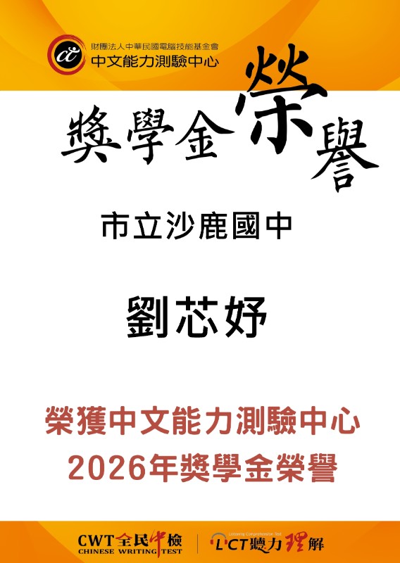 賀!本校劉芯妤同學榮獲中文能力測驗中心2026年獎學金榮譽!!