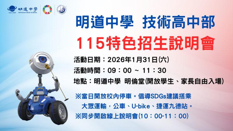 ☆115年明道特色招生☆ 特招說明會:115年1月31日(六)開放自由入場 來校參觀 實體說明會:09:00~11:30 明道中學 明倫堂 線上說明會:10:00~11:30 Google Meet線上(官網) 明道特招專區:https://reurl.cc/GGlZmd
