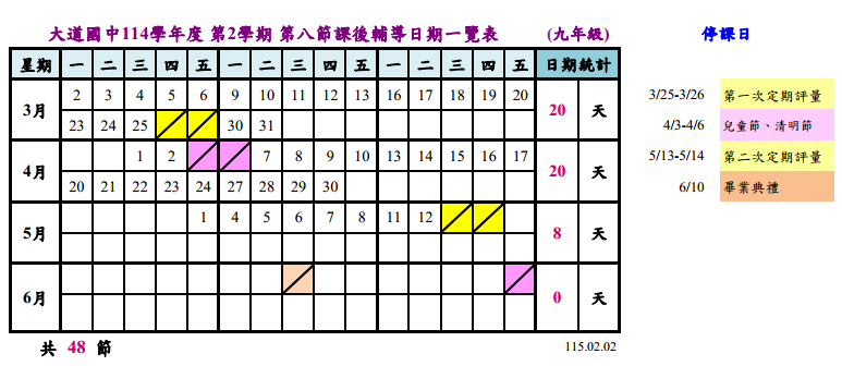 114-2第八節課後輔導日程及九年級晚自習一覽表