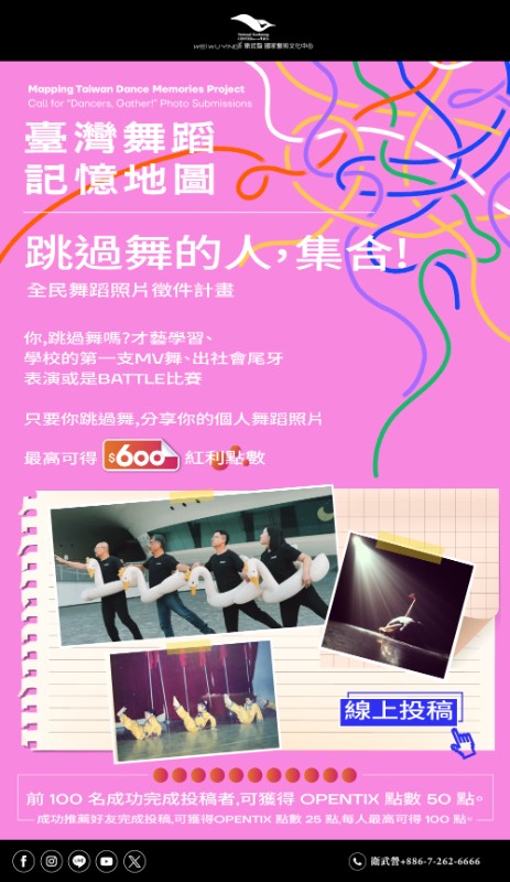 「跳過舞的人,集合!」全民舞蹈照片徵件活動參考簡章(附件二)或衛武營官網網址:https://npacwwy.tw/en08gMrIj,邀請師生共同參與投稿,擴大舞蹈記憶之蒐集與交流。 |
