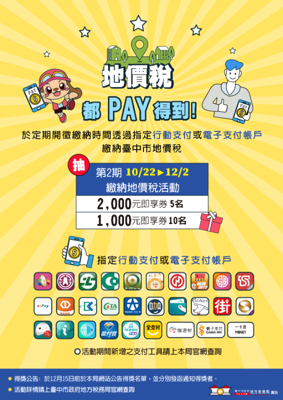 本局自即日起至12月2日止舉辦「地價稅都PAY得到」抽獎活動,凡於繳納期間使用指定行動支付或電子支付帳戶繳納本市地價稅成功者,即有機會獲得2,000元即享券,詳情請參考附件活動傳單。 |