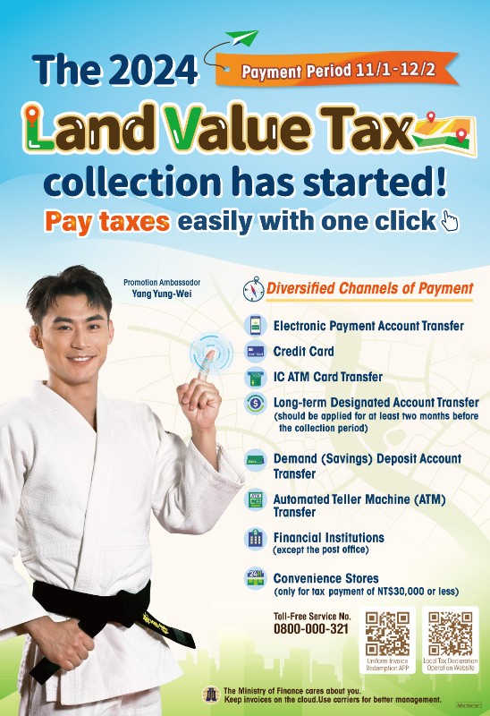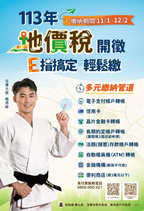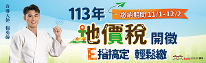 113年地價稅開徵囉!記得在12月2日前繳納,避免逾期受罰,更多資訊請上地方稅務局網站地價稅開徵專區查詢。 |