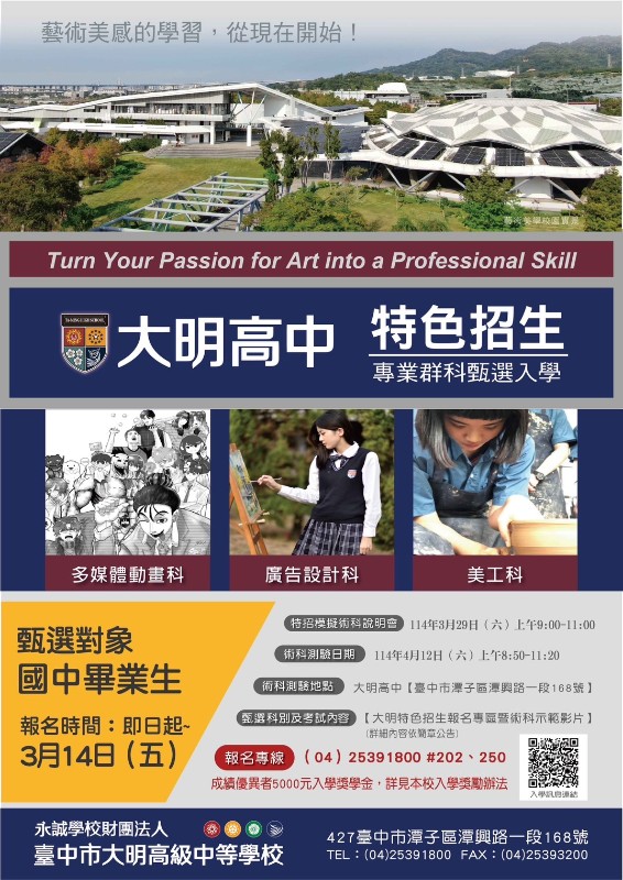 永誠學校財團法人臺中市大明高級中等學校114學年度特色招生專業群科甄選入學簡章及特色招生DM |