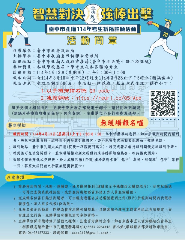 本所訂於114年4月13日(星期日)辦理「臺中市孔廟114年『智慧對決 強棒出擊』考生祈福許願活動」,請惠予協助宣傳,請查照。 |