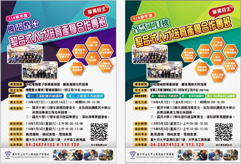 臺中市立大甲工業高級中等學校114學年度臺中市「契合式人才培育產學合作專班」招生簡章,敬請惠允公告,並鼓勵踴躍報考,請轉知。
