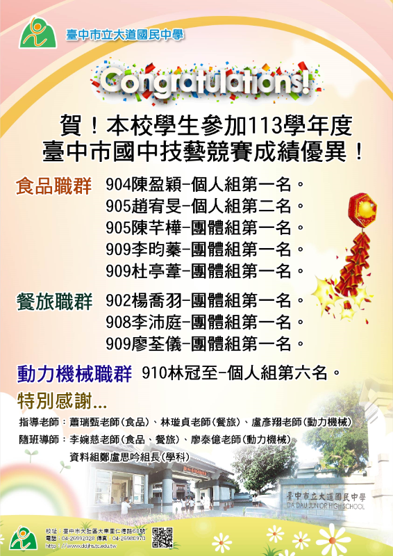 食品職群:904陳盈穎-個人組第一名食品職群:905趙宥旻-個人組第二名食品職群:905陳芊樺、909李昀蓁、909杜亭葦-團體組第一名餐旅職群:902楊喬羽、908李沛庭、909廖荃儀-團體組第一名動力機械職群:910林冠至-個人組第六名