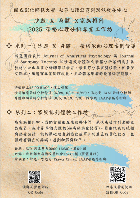 轉知彰師大辦理「沙遊 X 身體 X家族排列 2025 榮格心理分析專業工作坊」