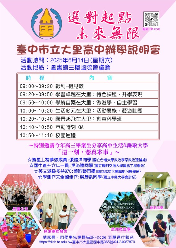 臺中市立大里高級中學114學年度辦學說明會相關資訊,請惠予協助公告並鼓勵國中應屆畢業學生及家長參加,請查照。說明:一、為使家長及學生瞭解本校辦學特色、教學資源及創意科學實驗課程,特辦理此說明會;懇請貴校惠予協助公告或群組訊息轉發,讓貴校家長多瞭解大里高中辦學現況。二、時間:114年6月14日(星期六)上午9時至11時。三、地點:本校圖書館三樓國際會議廳。四、說明會報名:請於6月13日(星期五)中午12時前填妥表單,以便掌握人數。報名連結:https://reurl.cc/nm2MQe五、相關升學資訊,可至本校網站查:https://dlsh.tc.edu.tw/