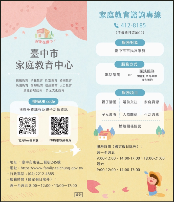 臺中市家庭教育中心服務項目及家庭教育諮詢專線宣導卡