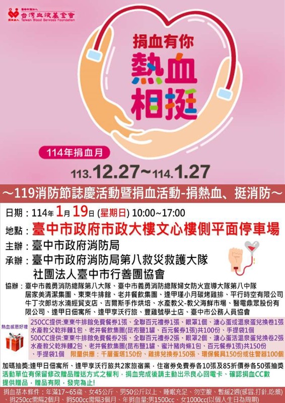 | 標題 | 臺中市公務人員協會-協辦「119消防節誌慶活動暨捐血活動-捐熱血挺消防」活動 |