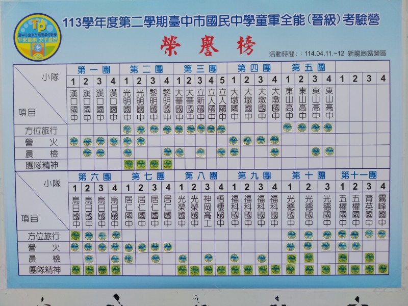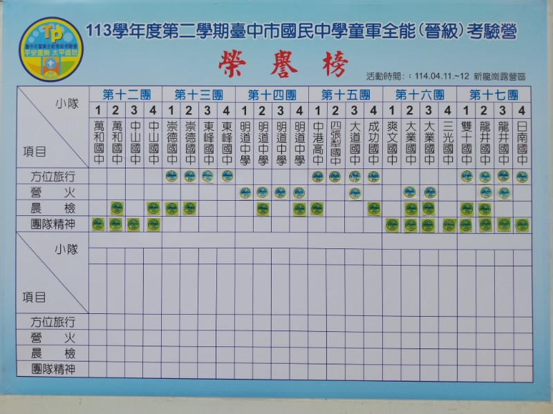狂賀!本校童軍團參加臺中市113-2國民中學童軍全能晉級考驗營!表現超亮眼! 【一、團體榮譽獎項】 烏日國中童軍團本次活動榮獲 1.【方位旅行】優勝學校 2.【營火表演】優勝學校 3.【晨檢】優勝學校(2小隊) 4.【團隊精神】優勝學校 共計5面榮譽錦旗 【二、個人榮譽獎項】 1.高級童軍 201林宜蓁、白宸源 202郭祐瑄、陳阡語、黃羿華、劉穎璇、謝采妍、陳文豪、陳煜翰 203陳予婕、陳映萁、楊瑄雅、劉于菁、王智弘、林煒晢、顏宏睿 204林采瑩、柯茗婕、陳姿丞、陳楊沛璇、趙恩宣、簡名珮、方育釩、石崴宇、劉宥鋌 #二年級25位童軍團團員全數通過高級考驗晉級高級童軍。 #高級童軍需通過1.觀察、2.訊號、3急救、4結繩、5露營、6工藝、7估測、8製圖、9工程、10.運動技能、11.資訊處理、12.休閒活動等12大項技能考驗(校外團長考驗)。 2.長城級童軍 304洪丞渝、曾定巧、趙世荃完成【長城級童軍】專科章考驗 3.國花級童軍 校友李虹宜 完成【國花級童軍】專科章考驗 4.專科章 (1)世界公民專科章:校友黃翊晏 (2)國家公民專科章:校友李辰星、304洪丞渝、304曾定巧、304趙世荃 (3)急救專科章:304洪丞渝、304曾定巧、304趙世荃 (4)交通專科章:校友黃翊晏、校友林亦喬、校友李辰星 (5)繪畫專科章:校友李虹宜、304曾定巧、304趙世荃、201林宜蓁 (6)音樂專科章:校友黃翊晏、校友林亦喬、校友李辰星 (7)攝影專科章:201林宜蓁、202黃羿華、202劉穎璇、202謝采妍、202陳煜翰、203陳映萁、 204柯茗婕、204方育釩 (8)個人衛生專科章:201林宜蓁、202黃羿華、202劉穎璇、202謝采妍、202陳煜翰、 203陳映萁、204柯茗婕、204方育釩 (9)公共衛生專科章:201林宜蓁、202黃羿華、202劉穎璇、202謝采妍、202陳煜翰、 203陳映萁、204柯茗婕、204方育釩、304洪丞渝 #感謝夏梅娟團主任委員、楊立蘭團長、許詠棠副團長、盧御珊副團長辛苦帶隊指導