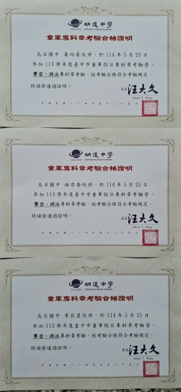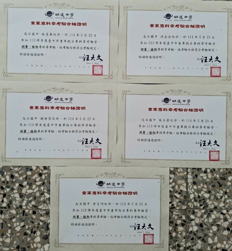 賀!本校童軍團同學參加 114年度臺中市明道中學童軍假日專科章考驗營 表現優異!全部通過各項專科考驗! 1.測量專科章:302林昱蓁、304朱玉棻、304洪丞渝、304曾定巧、304趙世荃 2.植物專科章:302林昱蓁、304朱玉棻、304洪丞渝、304曾定巧、304趙世荃 3.攀登專科章:校友李辰星、校友林亦喬、校友黃翊晏 4.游泳專科章:校友李辰星、校友林亦喬、校友黃翊晏 5.露營專科章:201林宜蓁 202黃羿華、202劉穎璇、202謝采妍、202陳煜翰 203陳映萁、203陳予婕 204柯茗婕、204陳楊沛璇、204方育釩 恭喜以上獲獎同學