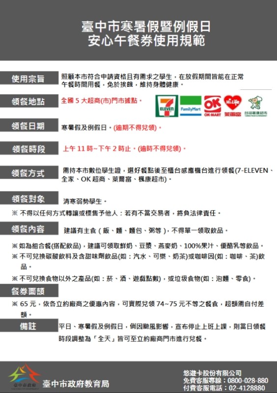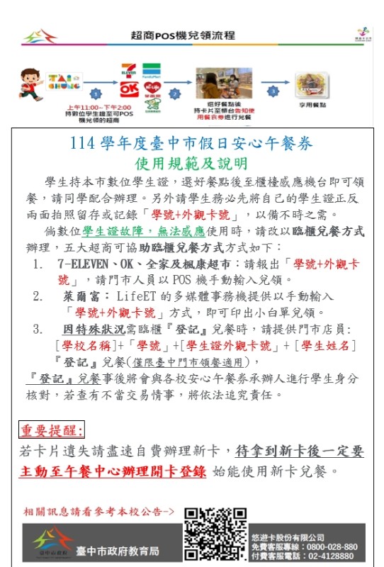 114學年度臺中市假日安心午餐券使用規範及說明 學生持本市數位學生證,選好餐點後至櫃檯感應機台即可領餐,請同學配合辦理。另外請學生務必先將自己的學生證正反兩面拍照留存或記錄「學號+外觀卡號」,以備不時之需。 倘數位學生證故障,無法感應使用時,請改以臨櫃兌餐方式辦理,五大超商可協助臨櫃兌餐方式方式如下: