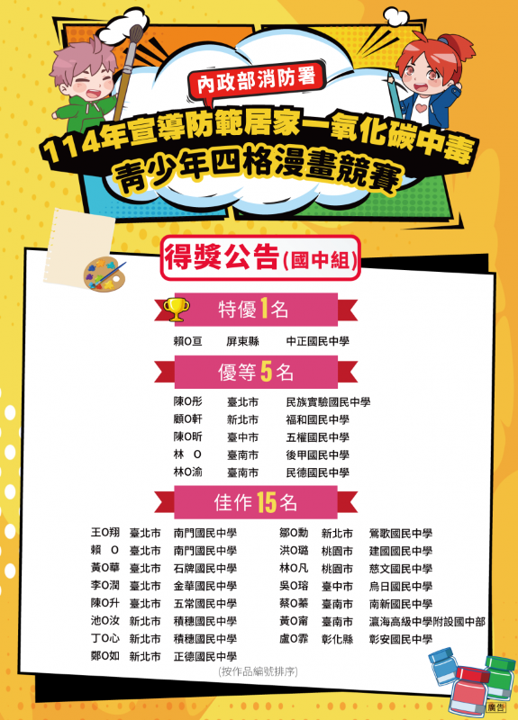 狂賀!本校美術團隊同學參加內政部防範一氧化碳中毒四格漫畫比賽榮獲全國 國中組佳作!