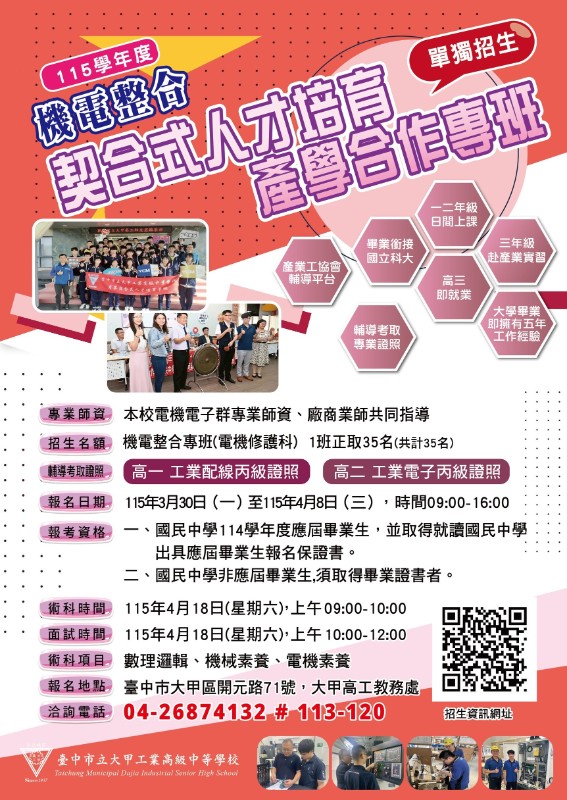 轉知:大甲高工115學年度實用技能學程契合式人才培育產學合作專班 |