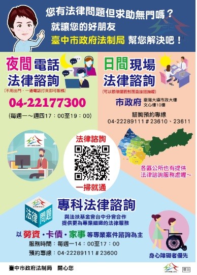 一、 許多民眾反應因工作、地緣因素而無法使用本府提供之法律諮詢服務,為提供民眾多元且便利使用之法律諮詢管道,本府於110年起,每週一至四,晚上17:00至19:00開辦夜間電話法律諮詢服務,專線電話:04-22177300,期能藉由延長法律諮詢服務時間,建構更完善的法律諮詢服務。 二、 如民眾欲與律師面對面直接諮詢法律問題,本府於臺灣大道市政大樓文心樓10樓,每週一至五,亦有提供日間現場法律諮詢,場次計有上午場(9:00至12:00)與下午場(14:00至17:00),民眾可於每場次開始前30分鐘至現場預約,亦可撥打諮詢預約專線:04-22289111分機23610、23611、或以網路先行預約(網址:https://legal-aid.taichung.gov.tw/)。 三、 復為協助遇有勞資糾紛、消費者卡債及家事案件等問題之民眾,本府特與財團法人法律扶助基金會台中分會合辦專科律師駐點諮詢服務,由該會指派專科法扶律師,於110年起,每週一下午14:00至17:00進駐本府法制局消費者服務中心專科法律諮詢室,提供現場法律諮詢服務,歡迎民眾前來諮詢。 |