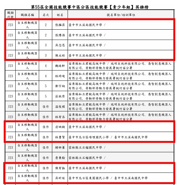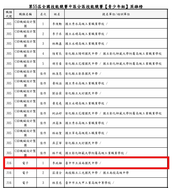 | 標題 | 第55屆全國技能競賽中區分區技能競賽【青少年組】英雄榜 |