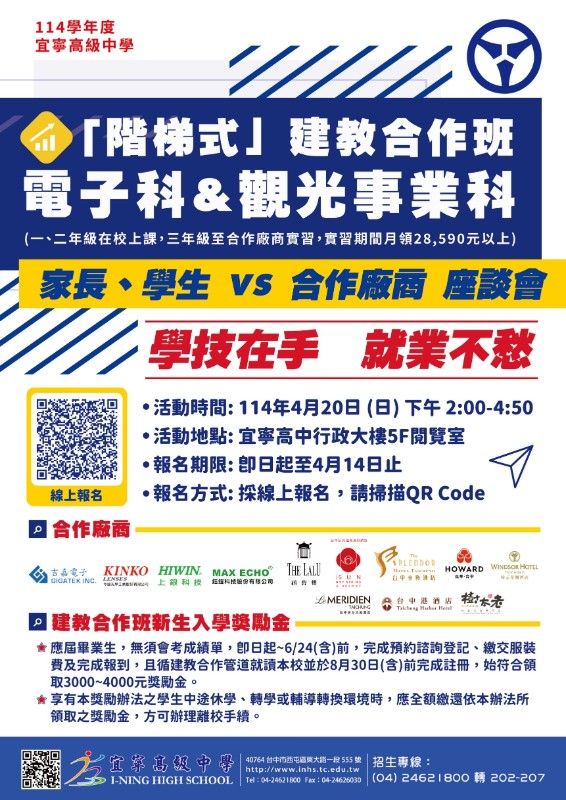 臺中市宜寧高級中學「未來高中生-探索體驗營」暨「階梯式建 教合作班學制暨合作廠商說明會」活動 說明: 或撥打招生專線04-24621800分機202~207;報名截止日詳如活動海報。