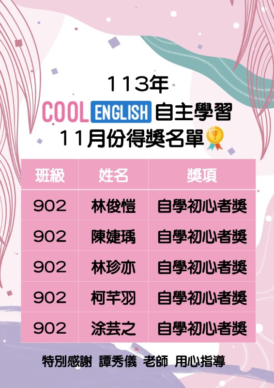 【113年11月份COOL ENGLISH 自主學習比賽】英雄榜 恭喜 302班 林俊愷、陳婕瑀、林珍亦、柯芊羽、涂芸之等6位同學獲得 自學初心獎! 指導老師:譚秀儀
