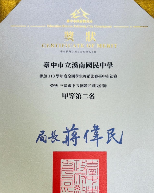| 標題 | 恭喜!本校榮獲【全國學生舞蹈比賽臺中市初賽國中B團體乙組民俗舞甲等】第二名! |