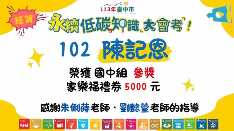 賀!陳記恩 獲「113年臺中市永續低碳知識大會考-國中組」參獎,獲家樂福禮券5,000元!