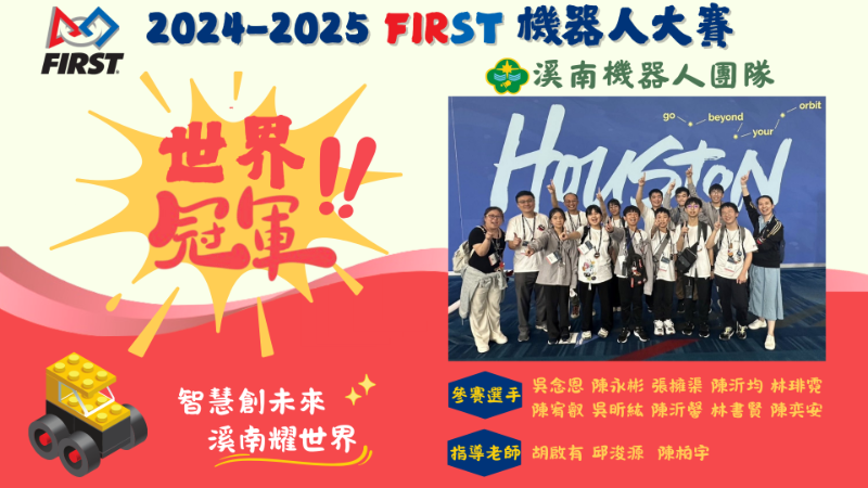 狂賀!本校勇奪【2024-2025 FIRST機器人大賽 】世界冠軍! 參賽選手:吳念恩、陳永彬、張擁渠、陳沂均、林琲霓、陳宥叡、吳昕紘、陳沂馨、林書賢、陳奕安 指導老師:胡啟有、邱浚源、陳柏宇