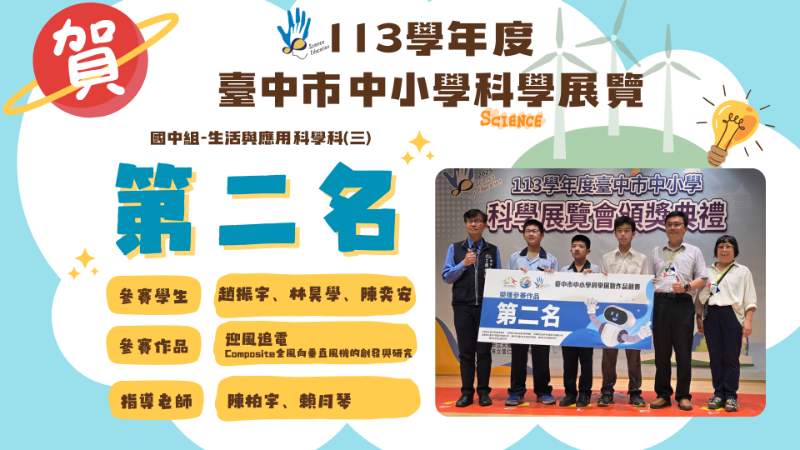 恭喜!本校學生參加【113學年度臺中市中小學科學展覽】榮獲國中組-生活與應用科學科(三)第二名! 參賽選手:趙振宇、林昊學、陳奕安 參賽作品:迎風追電~Composite全風向垂直風機的創發與研究 指導老師:陳柏宇、賴月琴