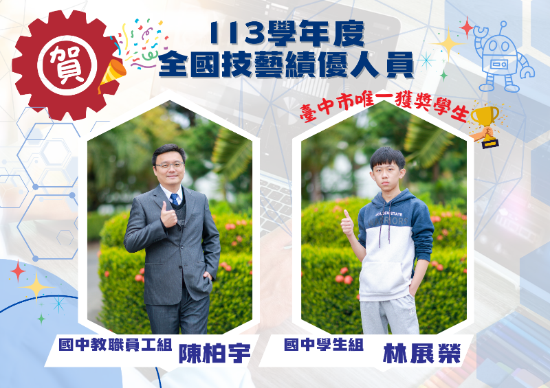 恭喜!陳柏宇老師及林展榮同學,榮獲 113學年度全國技藝績優人員獎項!