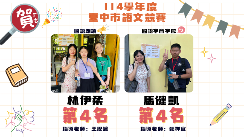 | 標題 | 恭喜!114學年度臺中市語文競賽獲獎英雄榜! |