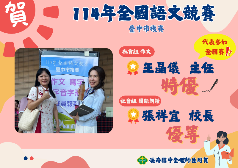 恭喜!本校王晶儀主任及張祥宜校長參加114年全國語文競賽臺中市獲得佳績!