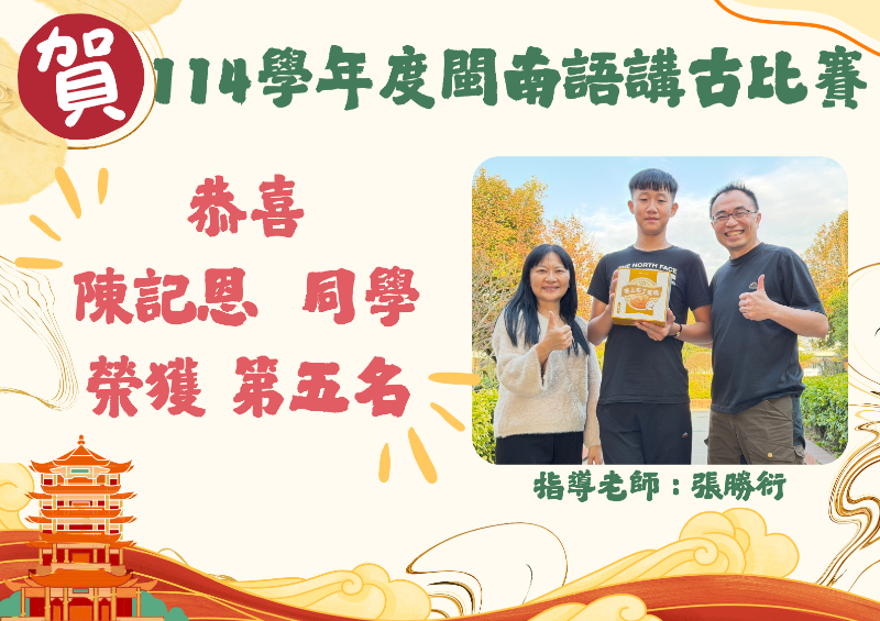 恭喜!陳記恩同學參加閩南語講古比賽榮獲第五名!
